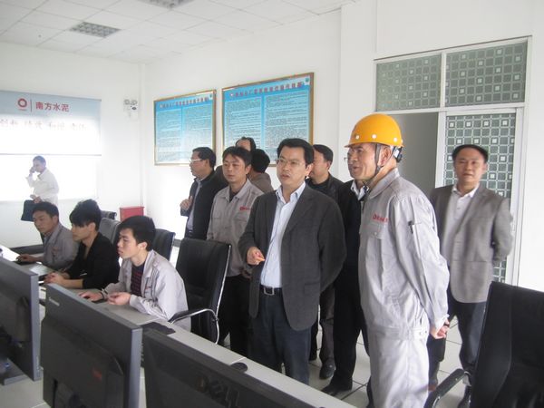 图为衡南县委书记曾祥月在衡南南方水泥公司中控室了解企业生产动态监控细节。