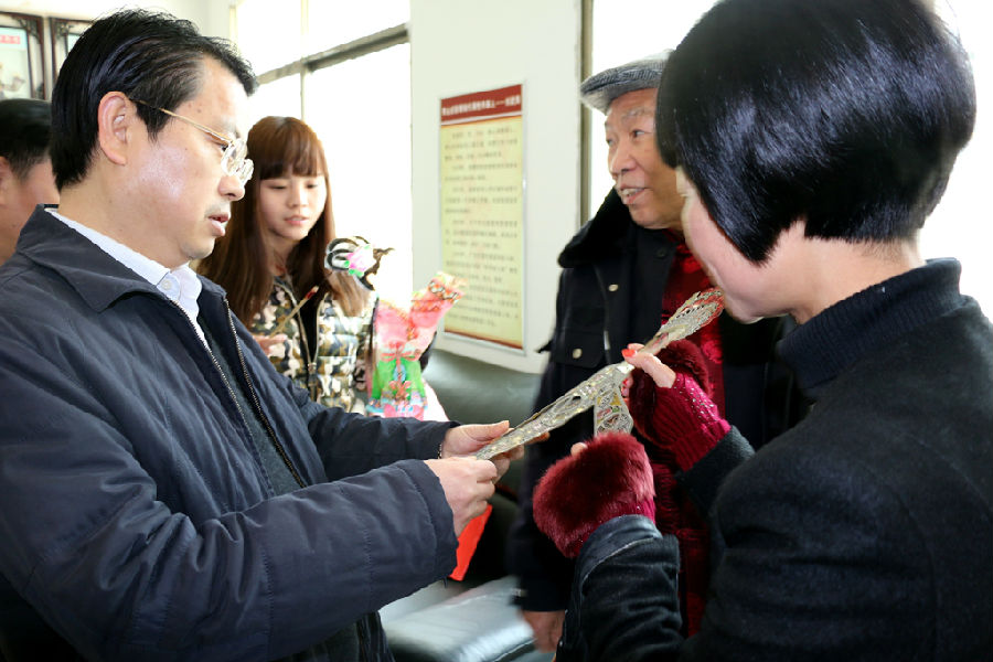 (曾祥月在县文化馆观摩皮影雕刻艺术。)