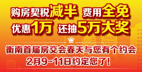 为最大限度让利于民,衡南首届房交会将推出四重让利:一是政府让利,在房交会期间成交的房屋,政府对购房业主按缴纳交易契税的50%给予购房补贴;二是部门让利,县房产局对展会期间成交房屋的服务性收费全免;三是银行让利,各商业银行对办理住房按揭贷款免收资料费、手续费,对办理期房或现房按揭(不包括商铺按揭),减免财产保险费;四是企业让利,各参展单位原则上对每套成交房屋优惠金额不低于1万元。