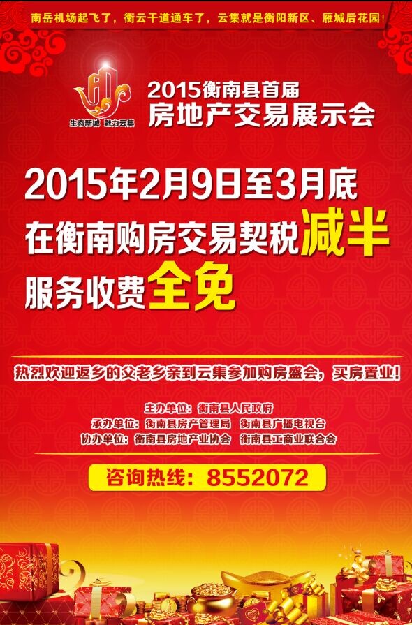 作为衡南房地产界的一次盛会,首届衡南房交会将于2月9日开幕,为期3天,持续至11日结束。本届房交会以“生态新城,魅力云集”为主题,共设展位35个,展位面积近2300㎡,参展企业30家,其中房地产开发企业23家,家居建材、装饰装修企业7家,其他展位5个,推出开发楼盘25个,可售商品房房源120万㎡(其中云集镇90万㎡,三塘镇30万㎡)。房交会将以市民们最为关心的环境、交通、品质为着力点,集中展示衡南的优质精品楼盘,旨在为想置业衡南的市民们提供全面、权威、及时的城市建设展示和楼盘信息咨询。