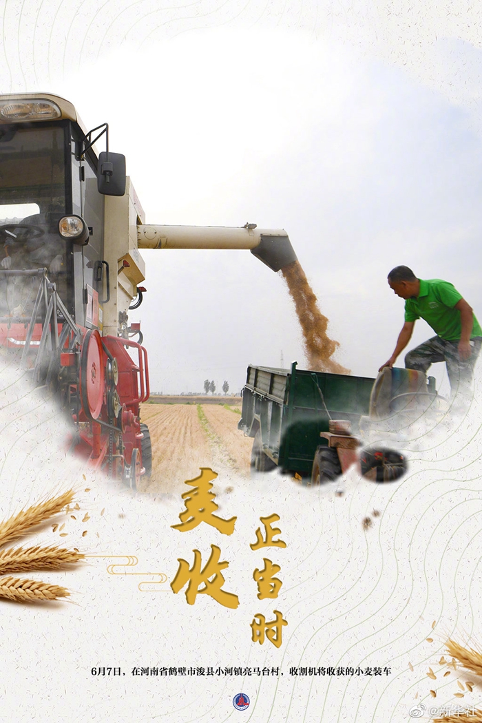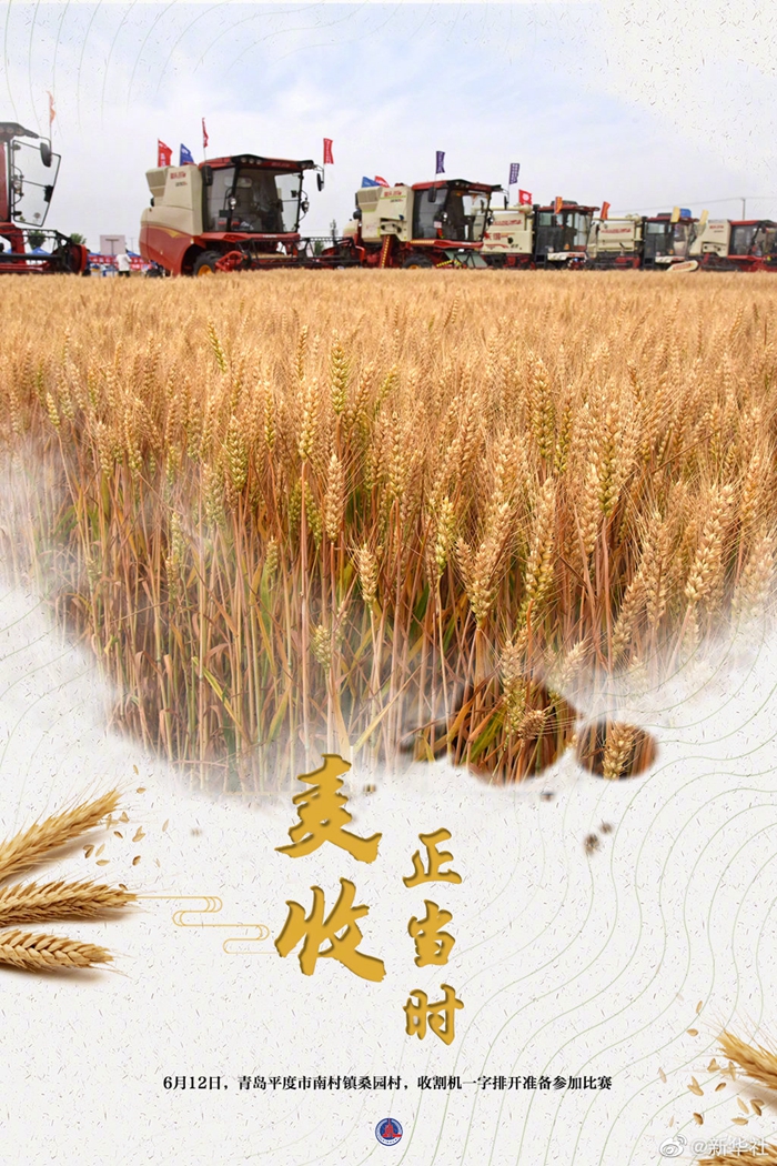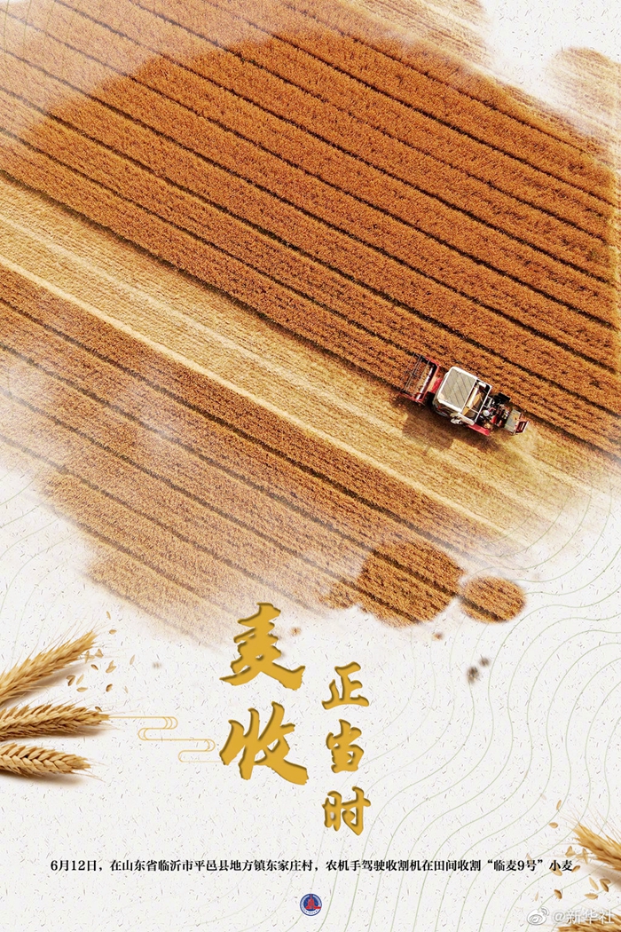 —分享— 风吹麦浪起,扑面穗生香。金色的麦田里,收割机带着隆隆的轰鸣声,在麦浪中来回忙碌,田间地头一派繁忙景象。一颗颗饱满的麦粒从收割机仓门倾泻而下,源源不断地被送上运粮车,颗粒归仓。 来源:新华社 编辑:邓敏